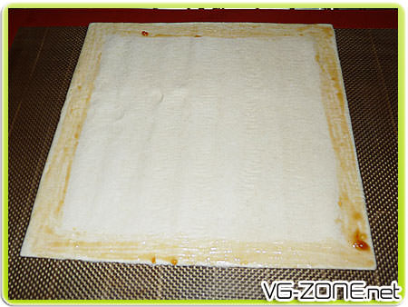 Dérouler une première pâte feuilletée et former un carré parfait, soit à l’aide d’un cadre de pâtisserie soit avec un couteau bien aiguisé. Poser une toile de cuisson sur la grille du four ou une plaque à pâtisserie et déposer délicatement le carré de pâte. (Si vous ne possédez pas une toile de cuisson, poser une double feuille de papier sulfurisé).