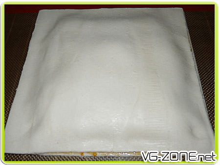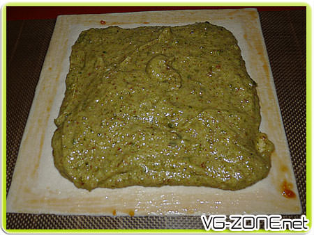 Badigeonner de confiture de mirabelles ou d’abricots avec un pinceau en silicone les 4 bords du carré (voir photo).